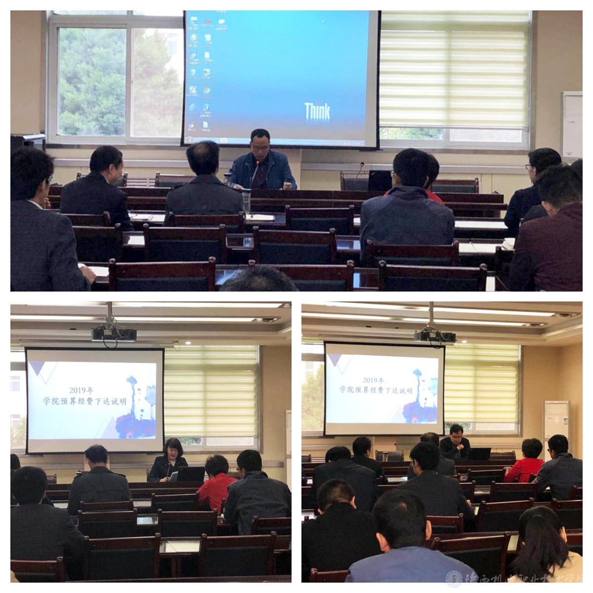 2019年04月12日上午,財務(wù)處、資產(chǎn)處在行政樓三樓東會議室召開2019年學(xué)院部門預(yù)算經(jīng)費下達說明會,學(xué)院領(lǐng)導(dǎo)及各部門負責(zé)人員參會。會議由向院長主持。