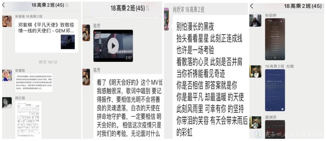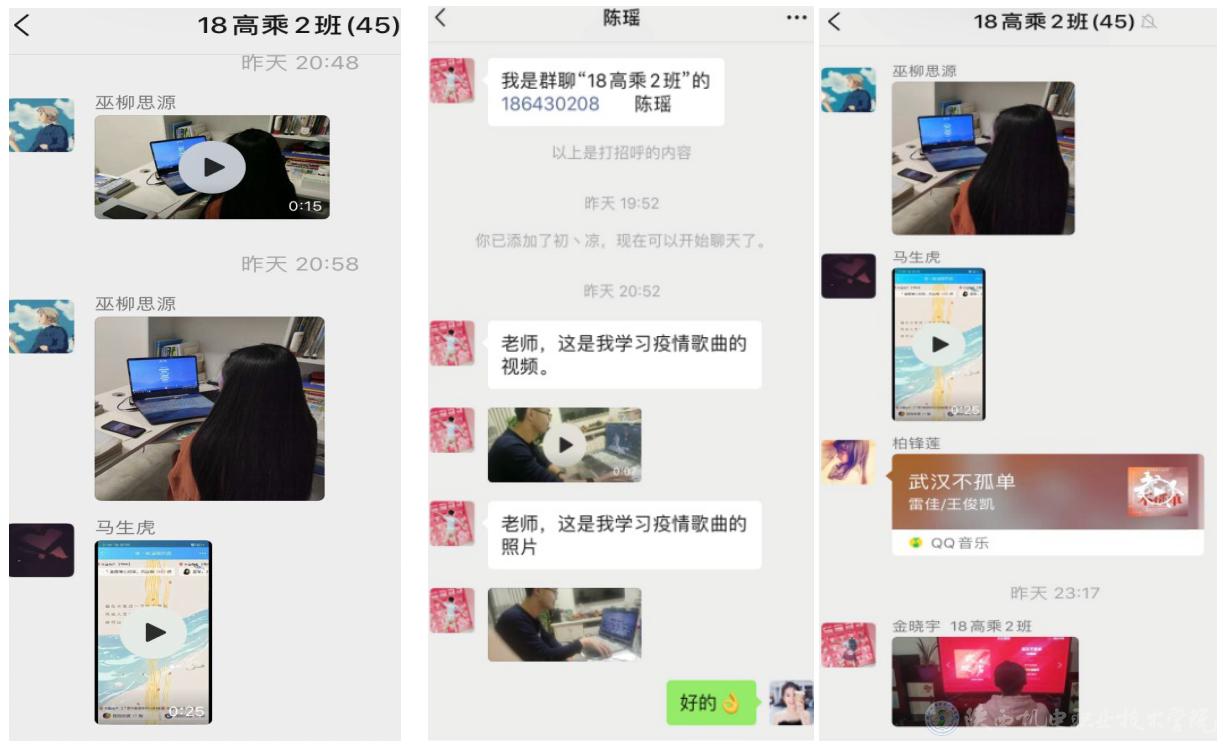 通過(guò)班級(jí)交流群對(duì)戰(zhàn)疫歌曲《平凡天使》的學(xué)習(xí)與討論,學(xué)生主動(dòng)展示自己的學(xué)習(xí)成果,有圖片、有音頻和視頻學(xué)習(xí)效果展示,聲樂(lè)教師姚穎駿對(duì)學(xué)生發(fā)來(lái)的視頻展示進(jìn)行了批閱以及互動(dòng)交流。