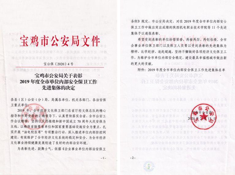 近日,寶雞市公安局下發(fā)《關于表彰2019年度全市單位內部安全保衛(wèi)工作先進集體的決定》(寶公保﹝2020﹞4號),我校被授予“寶雞市2019年度單位內部安全保衛(wèi)工作先進集體”榮譽稱號。