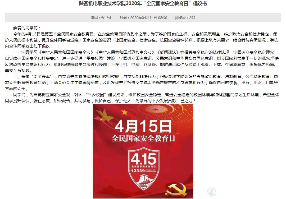 4月15日是我國第五個全民國家安全教育日,為深入貫徹習(xí)近平總書記總體國家安全觀,提高師生國家安全意識,增強國家安全責(zé)任,結(jié)合當(dāng)前疫情防控形勢和工作實際,我校通過多種形式組織開展主題活動。