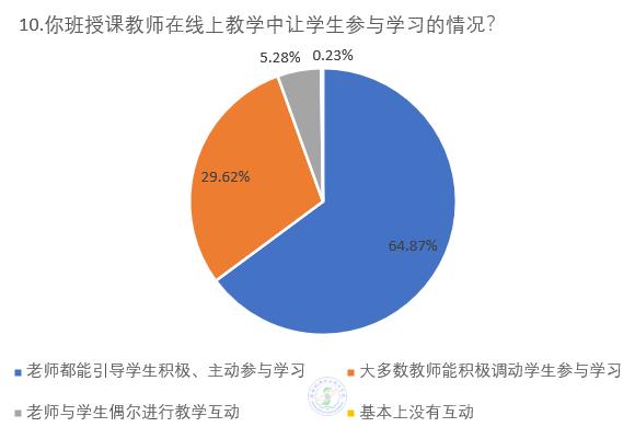 通過問卷調(diào)查數(shù)據(jù)分析:85%以上的同學(xué)認為授課教師線上教學(xué)工作認真,97.13%的學(xué)生感覺授課教師線上教學(xué)的課程準備較充分;94.49%的學(xué)生認為大多教師都能積極調(diào)動學(xué)生參與學(xué)習(xí);85.81%的同學(xué)認為線上教學(xué)教師的總體講授指導(dǎo)效果較好;87.48%的學(xué)生認為教師作業(yè)、課后輔導(dǎo)等方面的工作比較認真。教師“教”和學(xué)生“學(xué)”達到預(yù)期效果。