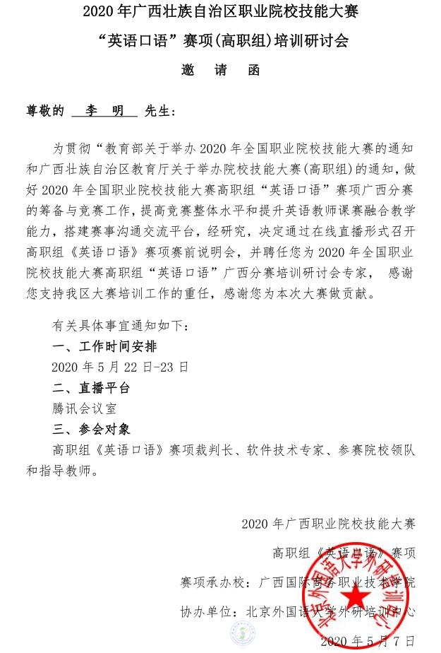 2020年5月22-23日,由廣西壯族自治區(qū)教育廳主辦,廣西國際商務(wù)職業(yè)技術(shù)學(xué)院、外語教學(xué)與研究出版承辦的廣西職業(yè)院校技能大賽英語口語賽項培訓(xùn)研討會隆重舉辦。為支持疫情防控工作,本次會議以線上研討的形式、依托騰訊會議平臺進(jìn)行。