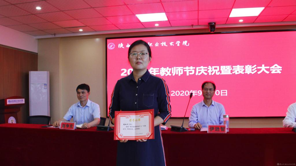黨委副書記、紀委書記齊曉軍宣讀“陜西省2020年高等教育師德標兵”表彰文件并為陜西省2020年高職教育師德標兵高白川頒發(fā)獎狀。
