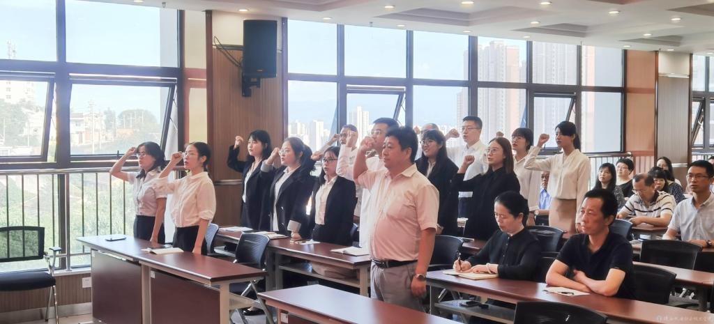 大會在雄壯的國歌聲中拉開帷幕,教師發(fā)展中心主任羅亞軍帶領新入職教師進行宣誓。
