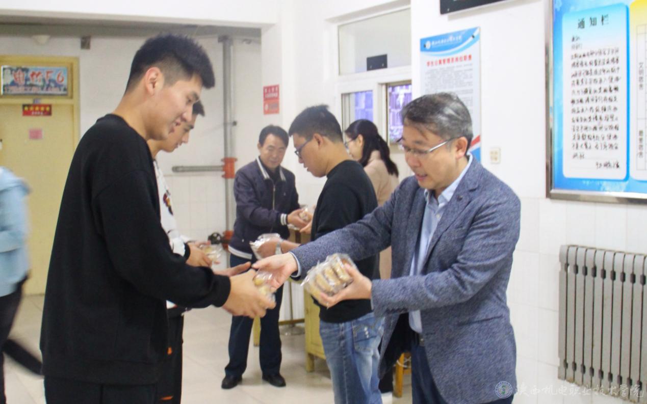 月到中秋分外明,人到佳節(jié)別樣親。中秋、國(guó)慶雙節(jié)當(dāng)日,為了讓留校的同學(xué)們也能感受到節(jié)日的氣氛與學(xué)院的溫暖,黨委書(shū)記伊遜智、副院長(zhǎng)張琴,學(xué)生處處長(zhǎng)王建斌、教務(wù)處副處長(zhǎng)高賦及學(xué)生處的教師們,為身處異鄉(xiāng)的同學(xué)們送去了節(jié)日的問(wèn)候,為留校學(xué)生免費(fèi)發(fā)放月餅。