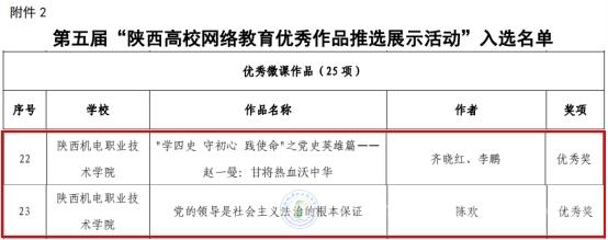 在“陜西高校網絡教育優(yōu)秀作品推選展示活動”遴選中,由齊曉紅、李鵬老師創(chuàng)作的《“學四史 守初心 踐使命”之黨史英雄篇——趙一曼:甘將熱血沃中華》、陳歡老師創(chuàng)作的作品《黨的領導是社會主義法治的根本保證》獲優(yōu)秀微課作品組優(yōu)秀獎。