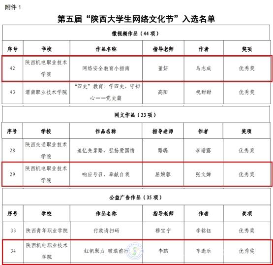 由董妍老師指導,馬志成同學創(chuàng)作的作品《網絡安全教育小指南》獲微視頻組優(yōu)秀獎;由屈婉蓉老師指導,張文嬋同學創(chuàng)作的作品《響應號召,奉獻自我》獲網文組優(yōu)秀獎;由李鵬老師指導,車遨樂同學創(chuàng)作的作品《紅帆聚力 破浪前行》獲公益廣告組優(yōu)秀獎。