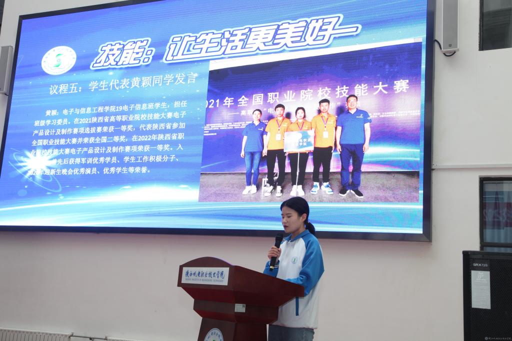 鐵道工程學(xué)院教師代表張新蕾、電子與信息工程學(xué)院學(xué)生代表黃穎分別發(fā)言?,F(xiàn)場共同欣賞了新時代我校學(xué)子“紅心向黨 技能強(qiáng)國”青春宣言短片和經(jīng)管與藝術(shù)學(xué)院帶來的教學(xué)技能展示。