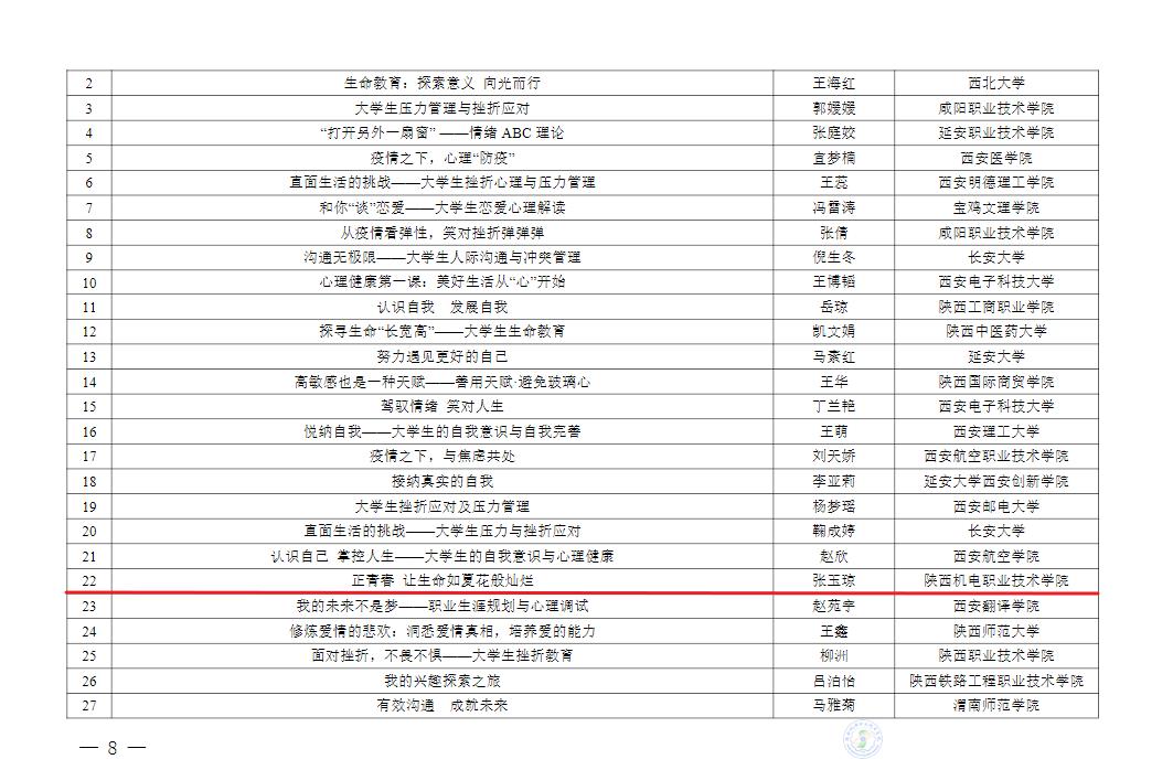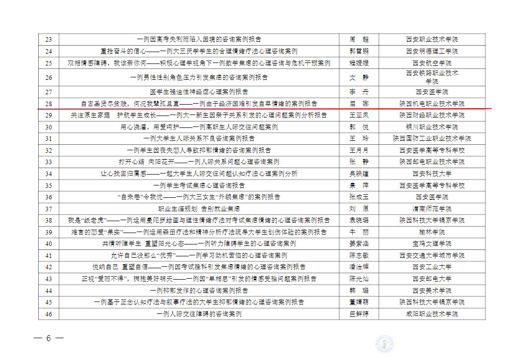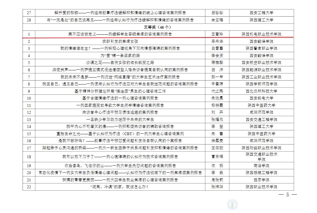 第八屆陜西高校心理健康教育優(yōu)秀咨詢案例推選中,我校教師 王雪玲、屈娜 分獲 三等獎。