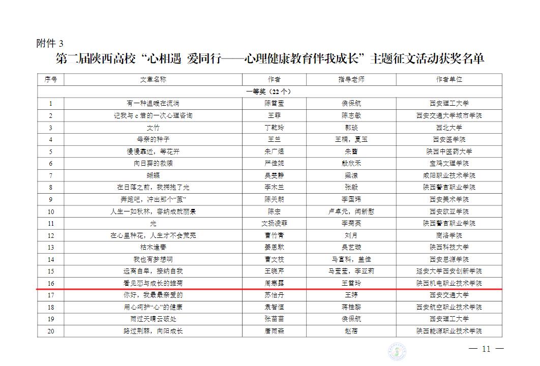 第二屆陜西高校“心相遇愛同行——心理健康教育伴我成長”主題征文活動中我校學生 周寒露 獲得 一等獎(指導教師王雪玲)、楊佳偉 獲得 三等獎(指導教師張玉瓊)。