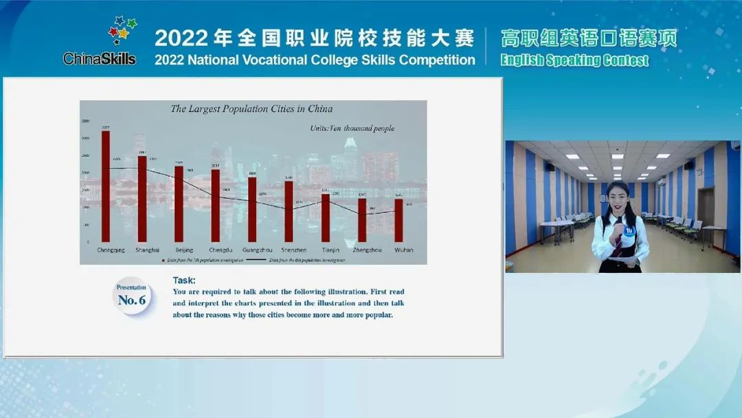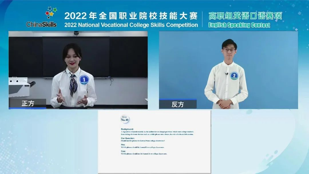 本賽項共包括“中國故事”“情景交流”“職場描述”“職場辯論”四個競賽環(huán)節(jié)。在“中國故事”環(huán)節(jié),選手發(fā)表精彩演講,講述中國故事,弘揚中華文化;在“情景交流”環(huán)節(jié),選手與提問嘉賓模擬職場職業(yè)情境問答;在“職場描述”環(huán)節(jié),選手根據(jù)賽題圖片分析行業(yè)、企業(yè)發(fā)展趨勢或社會、經(jīng)濟等熱點問題,闡述個人觀點;在“職場辯論”環(huán)節(jié),選手圍繞職業(yè)領域的社會熱點問題激烈辯論。比賽精彩紛呈、高潮迭起,選手以妙語連珠彰顯語言藝術,以職場思辨比拼能力素養(yǎng),以線上互動連結賽場內(nèi)外,充分展現(xiàn)了新時代高職院校外語技能人才的青春風采。
