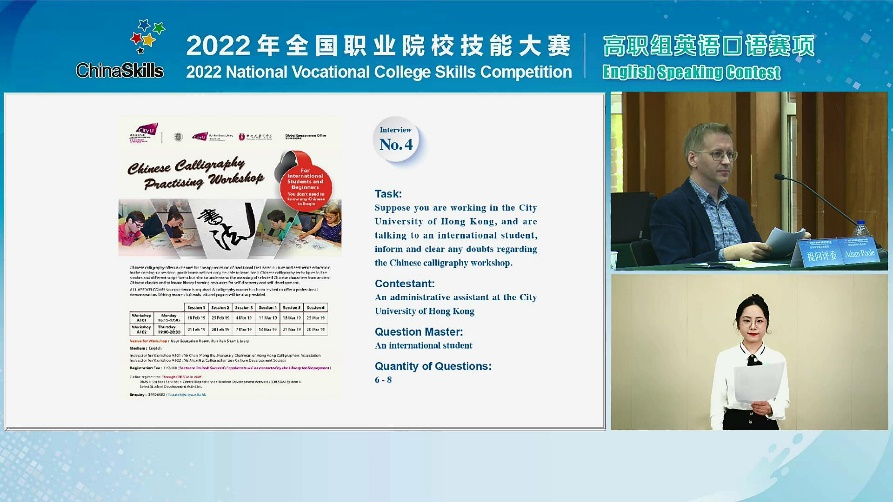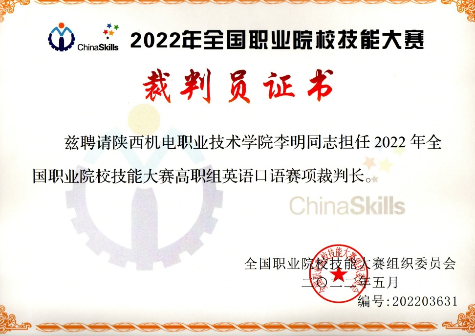 2022年9月26日,全國職業(yè)院校技能大賽高職組英語口語賽項順利開賽,經(jīng)大賽辦、執(zhí)委會遴選,我院名師工作室主持人、基礎部李明副教授受邀,擔任本屆大賽裁判長。