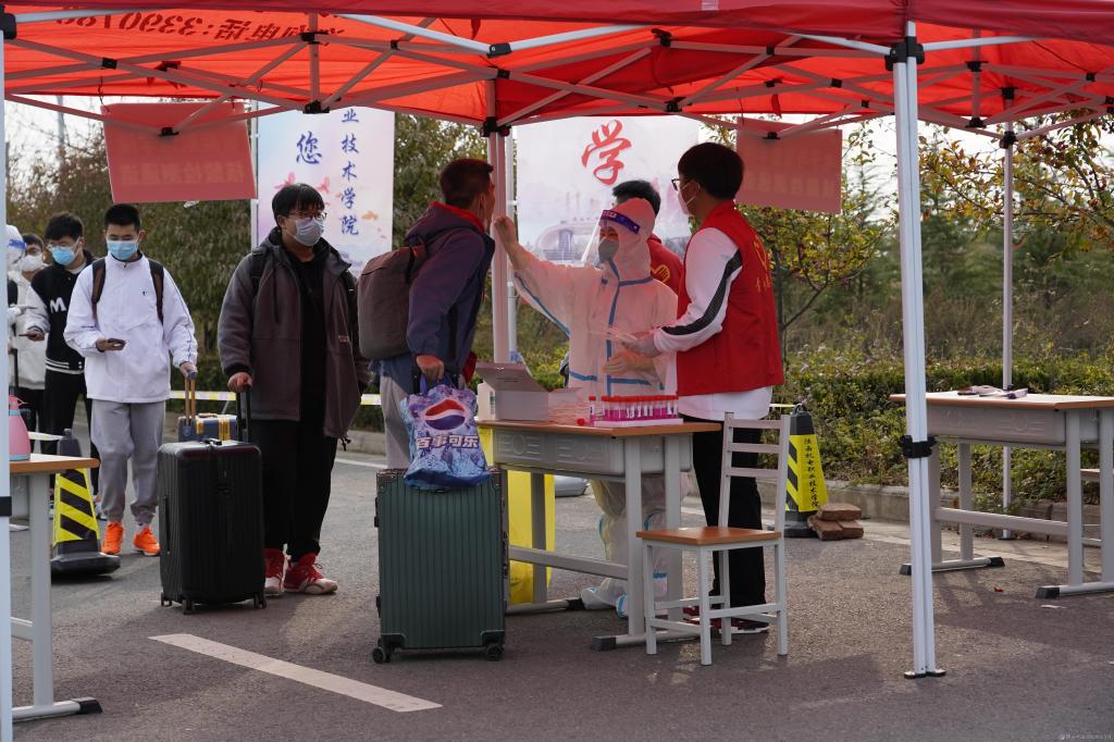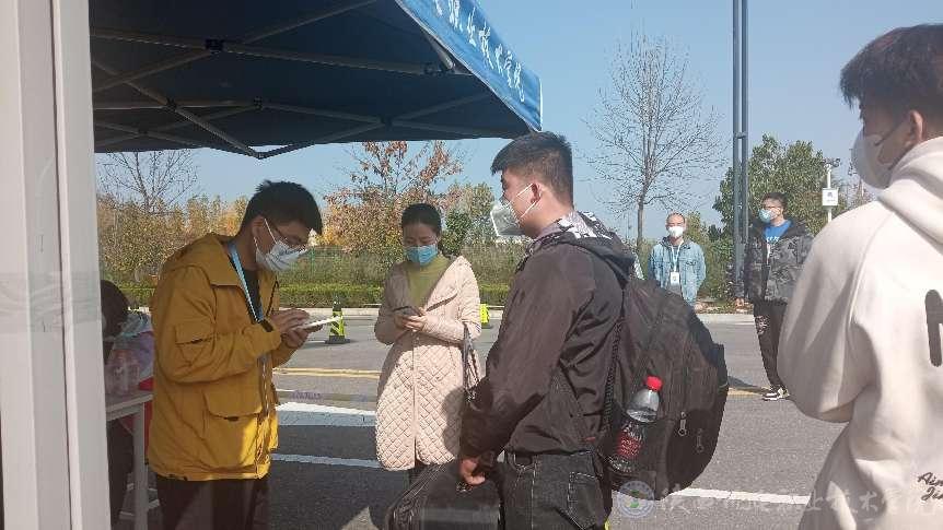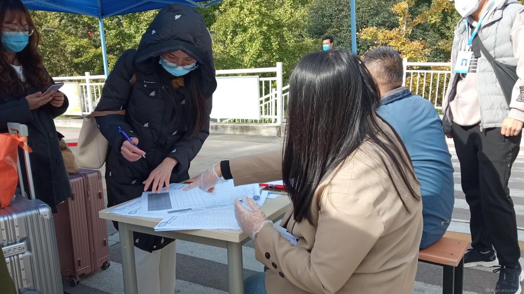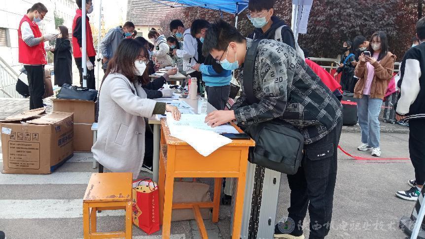 老師們?cè)缫褱?zhǔn)備好迎接每一位回家的孩子?!跋茸龊怂帷敝驹刚咛嵝训健W(xué)生們間隔一米線,戴好口罩,依次進(jìn)行核酸檢測(cè)。“大家按照二級(jí)學(xué)院排隊(duì)登記”老師親切的聲音在耳畔響起,老師們?cè)敿?xì)詢問(wèn)學(xué)生返校的信息,如乘坐什么交通工具,車次,車牌號(hào)……“這位同學(xué)按照疫情防控要求需要居家監(jiān)測(cè)”,“好的,請(qǐng)同學(xué)這邊來(lái)先登記信息”。從校門口的掃碼到進(jìn)校后的核酸、登記排查,每一個(gè)環(huán)節(jié),老師們都做到了精準(zhǔn)。