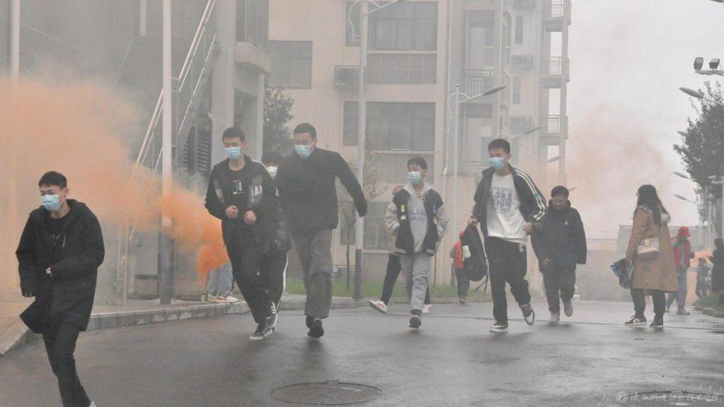 下午1點(diǎn)整,隨著廣播“宿舍樓發(fā)生火災(zāi),請(qǐng)同學(xué)們立即撤離”指令的下達(dá),全體師生開始有序撤離,蟠龍校區(qū)3000余名師生全部安全疏散完畢總耗時(shí)3分50秒。