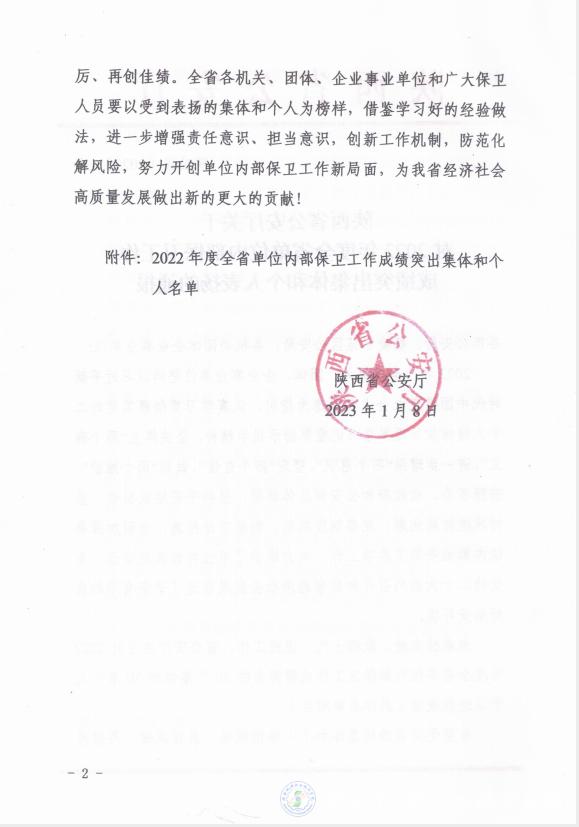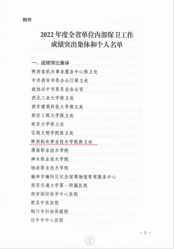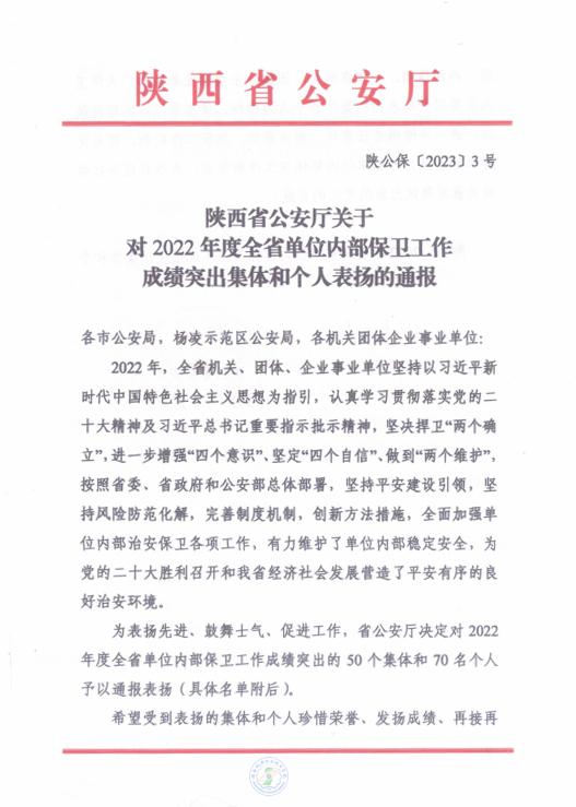 近日,陜西省公安廳發(fā)布了《陜西省公安廳關(guān)于對2022年度全省單位內(nèi)部治安保衛(wèi)工作成績突出集體和個人表揚的通報》,我校保衛(wèi)處喜獲“全省單位內(nèi)部治安保衛(wèi)工作成績突出集體”榮譽稱號,同時獲得寶雞市公安局金臺區(qū)“2022年度治安重點單位先進集體”,保衛(wèi)處副處長常小凱同志被評為“2022年度金臺區(qū)治安重點單位保衛(wèi)工作先進個人”。
