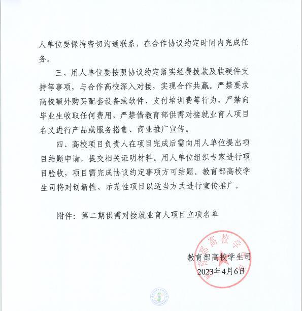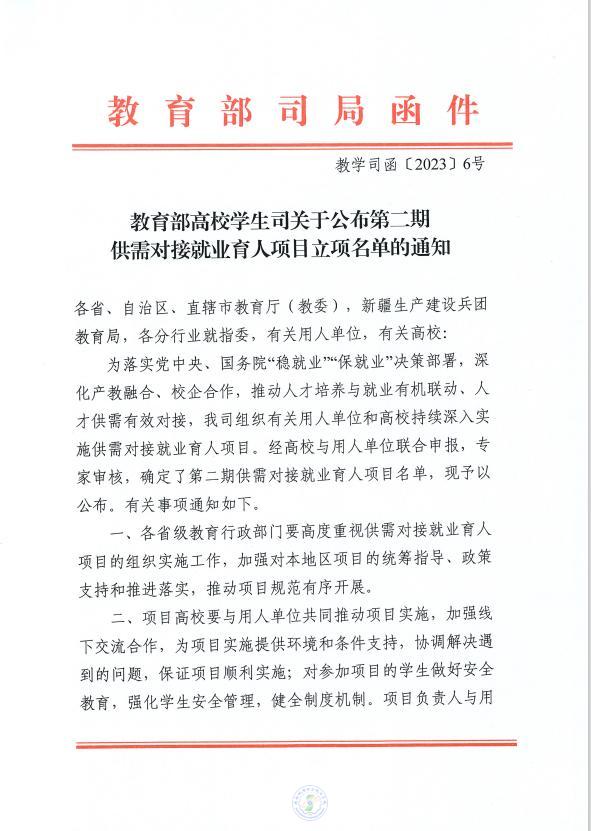 教育部供需對(duì)接就業(yè)育人項(xiàng)目是為深入貫徹落實(shí)黨中央、國務(wù)院“穩(wěn)就業(yè)”“保就業(yè)”決策部署,深化產(chǎn)教融合、校企合作,推動(dòng)人才培養(yǎng)與就業(yè)有機(jī)聯(lián)動(dòng)、人才供需有效對(duì)接,由教育部高校學(xué)生司組織有關(guān)用人單位和高校實(shí)施的就業(yè)育人項(xiàng)目。2022年10月,教育部發(fā)布了第二期供需對(duì)接就業(yè)育人項(xiàng)目申報(bào)指南,學(xué)校招生就業(yè)處聯(lián)合各學(xué)院積極聯(lián)系相關(guān)企業(yè),認(rèn)真了解企業(yè)發(fā)展、人才培養(yǎng)、項(xiàng)目申報(bào)等相關(guān)情況,積極組織推進(jìn)此次項(xiàng)目申報(bào)工作。最終,經(jīng)教育部審核,3項(xiàng)申報(bào)項(xiàng)目獲得批準(zhǔn)。