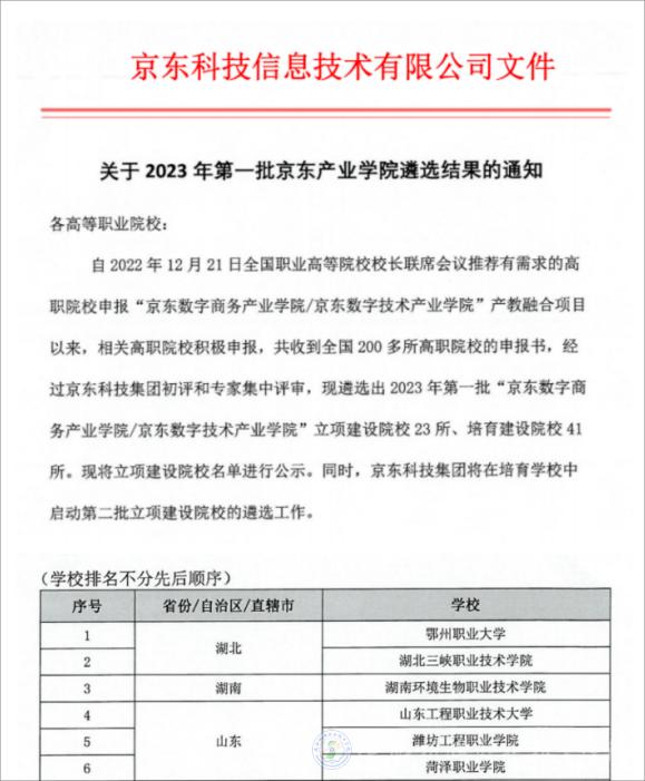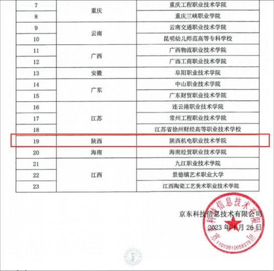 2023年5月4日,京東集團發(fā)布《關(guān)于2023年第一批京東產(chǎn)業(yè)學院遴選結(jié)果的通知》,公布了立項建設(shè)院校23所,陜西機電職業(yè)技術(shù)學院從參與的200多所高職院校中脫穎而出,成為陜西省唯一入選院校。