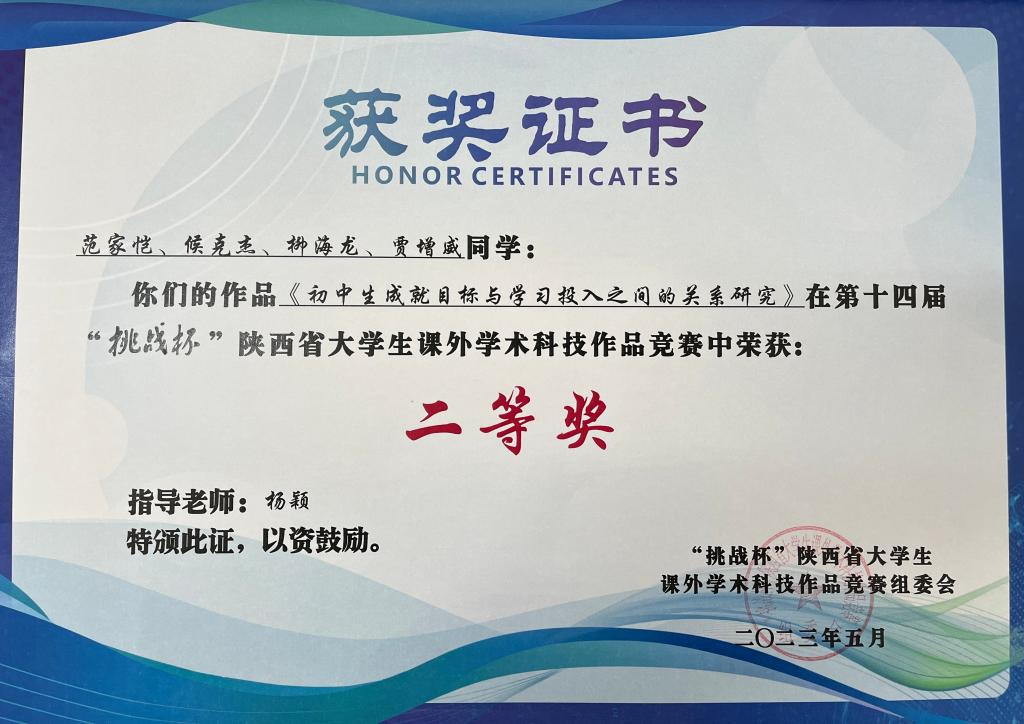 5月20日下午,第十四屆“挑戰(zhàn)杯”陜汽集團陜西省大學生課外學術(shù)科技作品競賽在長安大學圓滿閉幕。我校參賽作品《初中生成就目標與學習投入之間的關(guān)系研究》榮獲大賽“二等獎”。