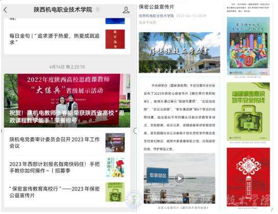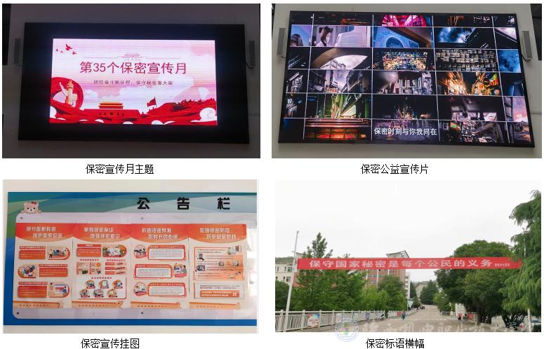 開(kāi)展一次保密主題宣傳。4月15日起,通過(guò)學(xué)校微信公眾號(hào)推送保密公益宣傳片、海報(bào)和保密科普教育視頻;黨政辦官網(wǎng)開(kāi)設(shè)保密工作專(zhuān)欄;博學(xué)樓一樓電子屏滾動(dòng)播放官方保密公益宣傳片、宣傳標(biāo)語(yǔ);博學(xué)樓公告欄張貼保密宣傳掛圖;寶福路校區(qū)懸掛保密宣傳橫幅,營(yíng)造了濃厚的宣教氛圍,促進(jìn)“維護(hù)國(guó)家安全,人人有責(zé)”意識(shí)入腦入心,進(jìn)一步樹(shù)牢了總體國(guó)家安全觀,增強(qiáng)了師生員工維護(hù)國(guó)家安全,保守國(guó)家秘密的責(zé)任感和使命感。