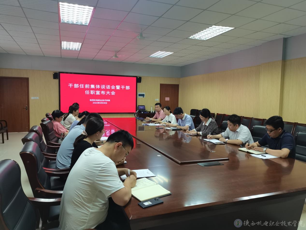 2023年6月26日下午,學校黨委在蟠龍校區(qū)圖書館二樓會議室召開干部任前談話暨干部任職宣布大會。黨委委員、院長助理、組織部部長趙爭東出席會議并講話,紀委副書記、紀律檢查室主任王芙蓉作集體廉政談話,黨委組織部綜合科科長張玉瓊主持并宣讀任職文件。新任職干部,電子與信息學院科級以上干部、教研室主任,人事處(教師發(fā)展中心、國際合作與交流處)全體人員參加會議。