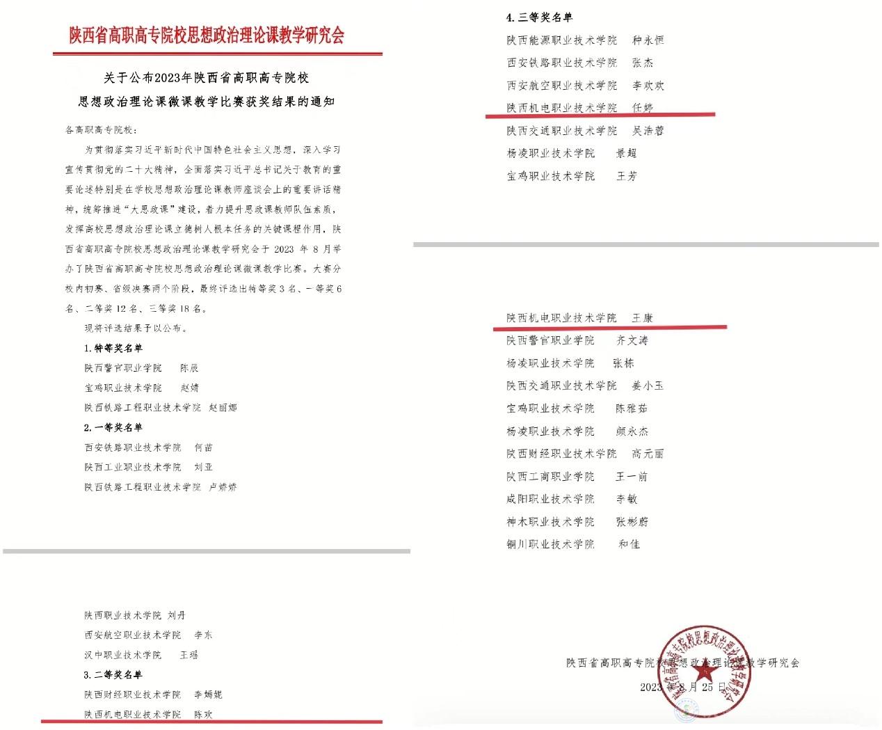 近日,陜西省高職高專院校思想政治理論課教學(xué)研究會(huì)公布了2023年陜西省高職高專院校思想政治理論課微課教學(xué)比賽獲獎(jiǎng)結(jié)果,我校馬克思主義學(xué)院陳歡老師獲二等獎(jiǎng),任婷、王康兩位老師獲三等獎(jiǎng)。