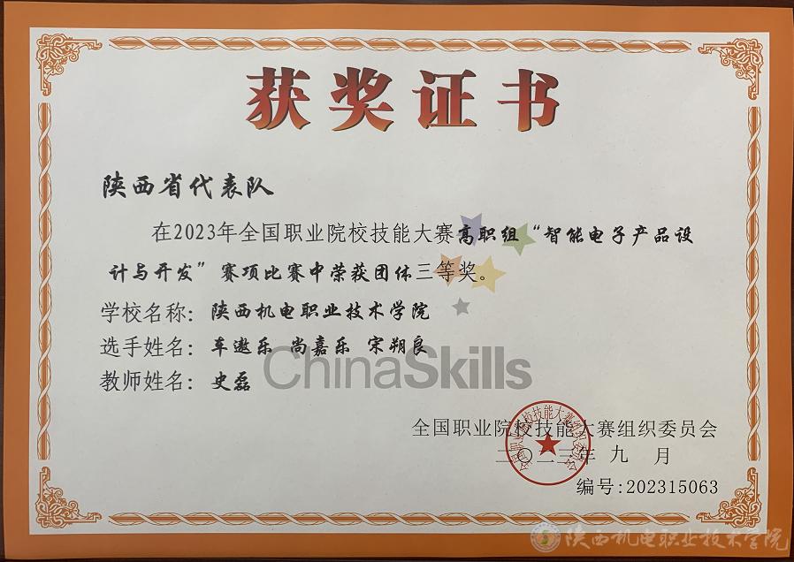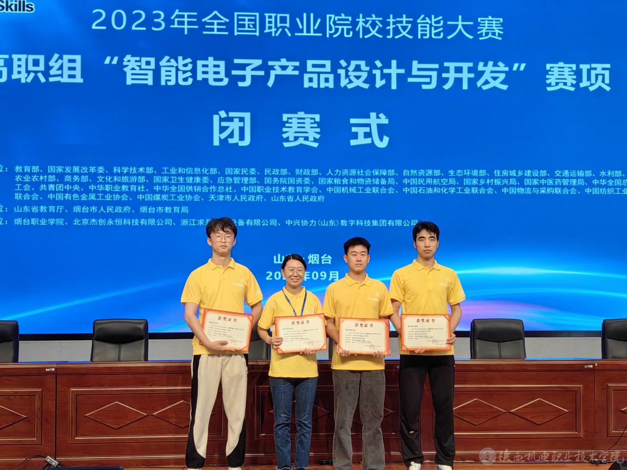 9月26—27日,2023年全國職業(yè)院校技能大賽高職組“智能電子產(chǎn)品設計與開發(fā)”賽項在山東煙臺舉行。我校電子與信息學院教師史磊與車遨樂、尚嘉樂、宋朔良三位同學組成的競賽隊代表陜西省,與來自全國31個省市區(qū)的59支參賽代表隊同臺競技,經(jīng)過2天激烈的角逐,榮獲團體三等獎。