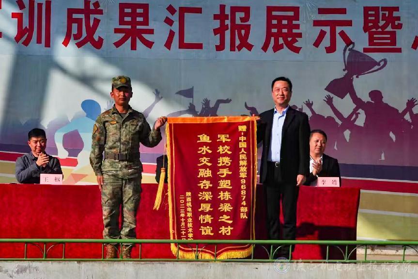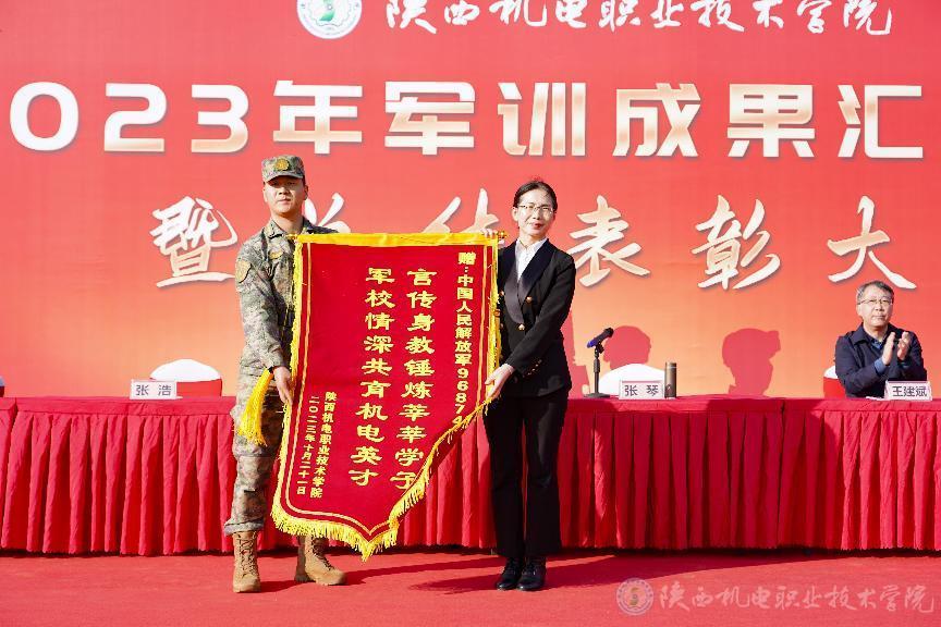 校領(lǐng)導(dǎo)代表學(xué)校向承訓(xùn)部隊贈送錦旗,對他們在軍訓(xùn)中的辛勤付出表示誠摯感謝。