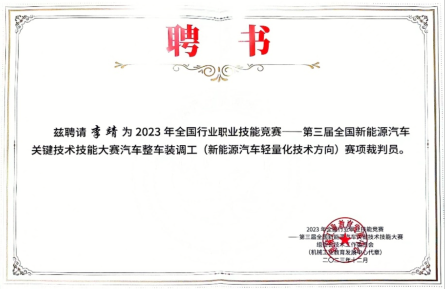 大賽期間,李靖積極與其他裁判員進(jìn)行賽項(xiàng)討論及業(yè)務(wù)交流,賽后積極與汽車(chē)整車(chē)裝調(diào)工(新能源汽車(chē)輕量化技術(shù)方向)賽項(xiàng)參賽選手深度交流。通過(guò)與來(lái)自全國(guó)各地車(chē)企職工和院校師生的交流,現(xiàn)場(chǎng)參與了目前國(guó)內(nèi)整車(chē)裝調(diào)的先進(jìn)技術(shù)技能,獲得了很多寶貴經(jīng)驗(yàn),為我校新能源汽車(chē)技術(shù)專(zhuān)業(yè)群發(fā)展以及大賽備賽方面提供了經(jīng)驗(yàn)支持。