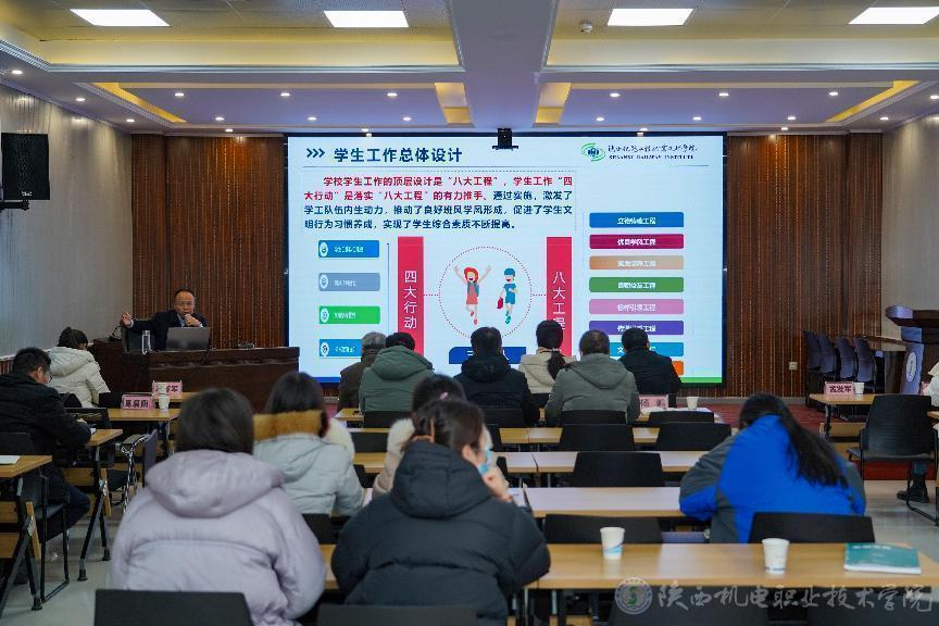為進(jìn)一步促進(jìn)我校輔導(dǎo)員、班主任隊(duì)伍建設(shè),提高學(xué)工隊(duì)伍專業(yè)化、職業(yè)化水平,我校特邀請(qǐng)陜西鐵路工程職業(yè)技術(shù)學(xué)院專家團(tuán)隊(duì)于12月26日下午在蟠龍校區(qū)博學(xué)樓會(huì)議室開展專題培訓(xùn),黨委副書記張琴,各二級(jí)學(xué)院黨支部書記、全校輔導(dǎo)員、班主任老師參加,活動(dòng)由黨委學(xué)工部部長(zhǎng)、學(xué)生處處長(zhǎng)王建斌主持。