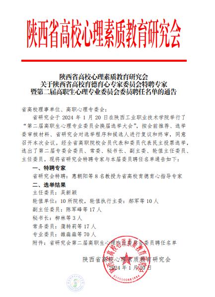 第二屆陜西省高職心理專業(yè)委員會(huì)換屆選舉大會(huì)暨陜西省高職院校2024年心理育人工作論壇于1 月20 日在陜西工業(yè)職業(yè)技術(shù)學(xué)院舉行,陜西省高校心理素質(zhì)教育研究會(huì)會(huì)長鄭林科,陜西工業(yè)職業(yè)技術(shù)學(xué)院黨委書記惠朝陽,黨委副書記賀天柱等領(lǐng)導(dǎo)參加會(huì)議。我校黨委學(xué)工部部長、學(xué)生處處長王建斌,心理教育